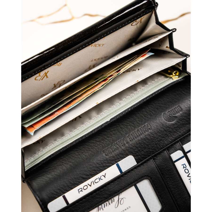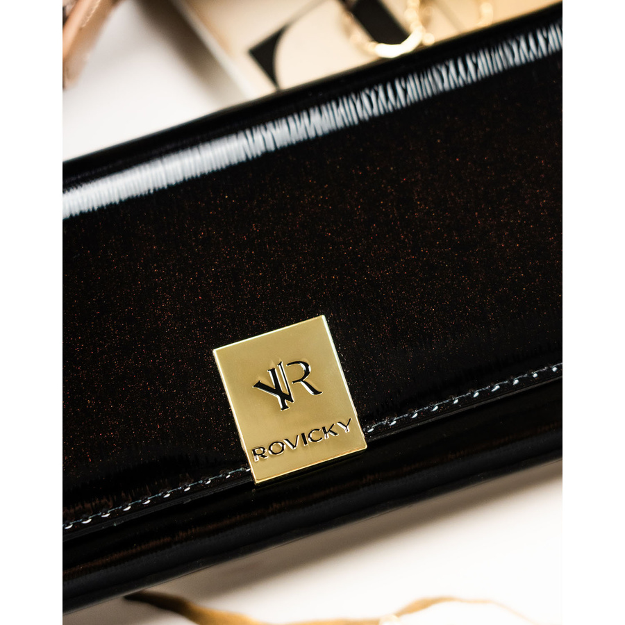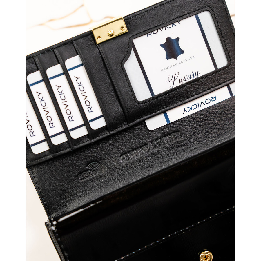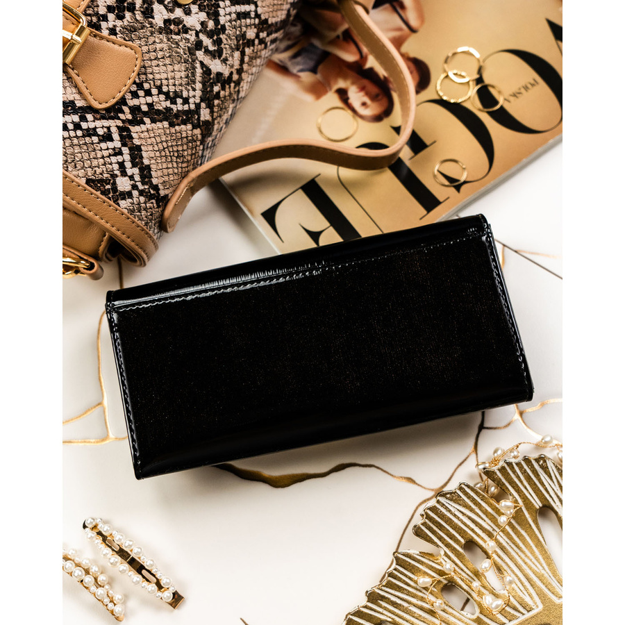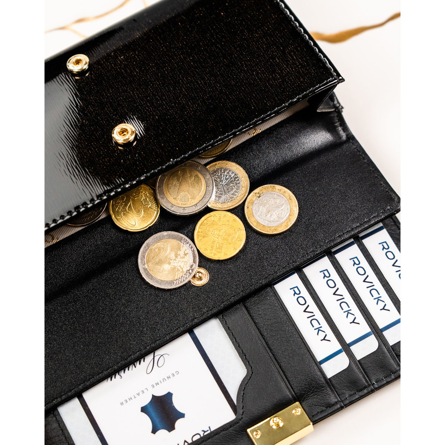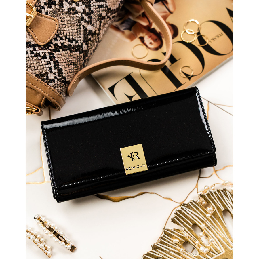 Duży portfel damski z lakierowanej skóry naturalnej w czarnym kolorze zamykany na zatrzask - Rovicky