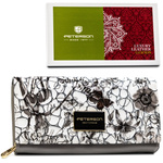 Duży, poziomy portfel damski na zatrzask, wykonany z lakierowanej skóry naturalnej w kwiatowy wzór - Peterson